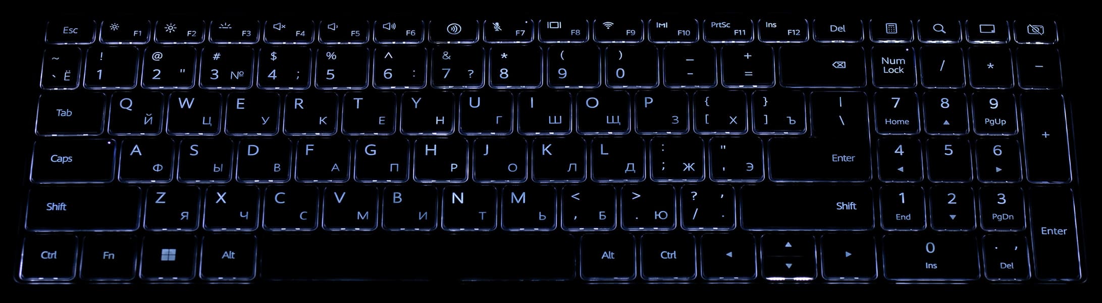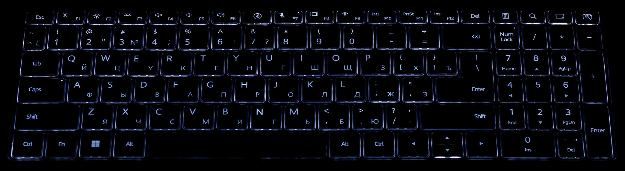 Из плюсов клавиатуры — наличие цифрового блока и ход клавиш 1,5 мм с отчетливо ощущаемым срабатыванием, а из минусов — уменьшенная высота стрелок вверх и вниз и миниатюрные функциональные кнопочки.