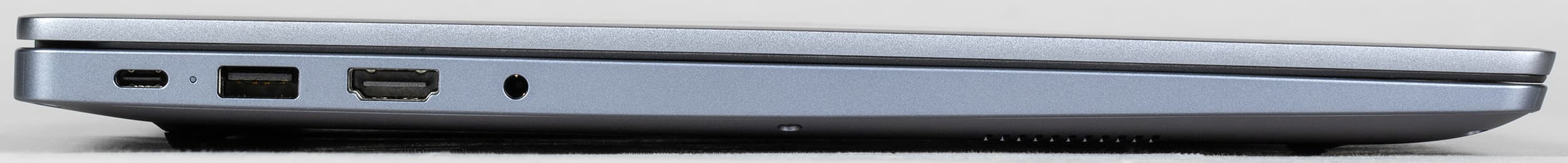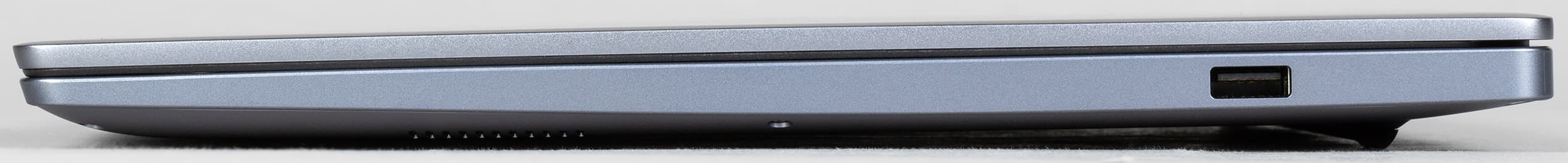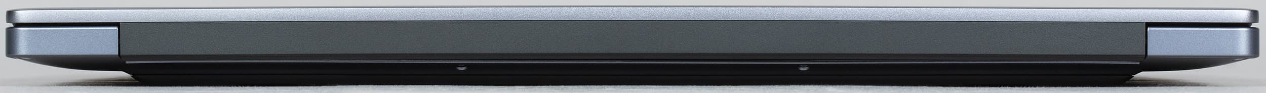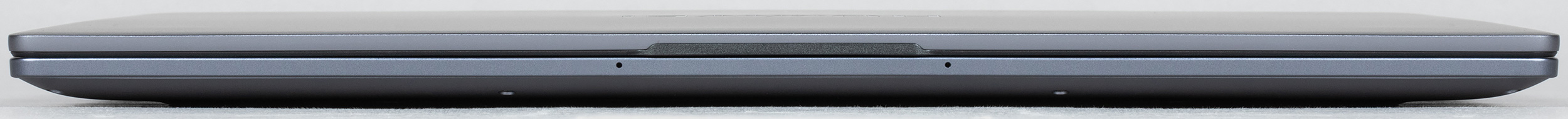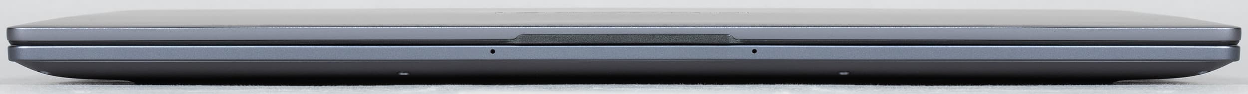 Толщина переднего торца ноутбука составляет всего 11 мм, то есть визуально он кажется довольно тонким. Здесь сохранилась небольшая выемка для удобного зацепа крышки пальцами, но остались только два микрофона (микроточки на торце) против четырех у модели 2023 года. Весьма странная «оптимизация».