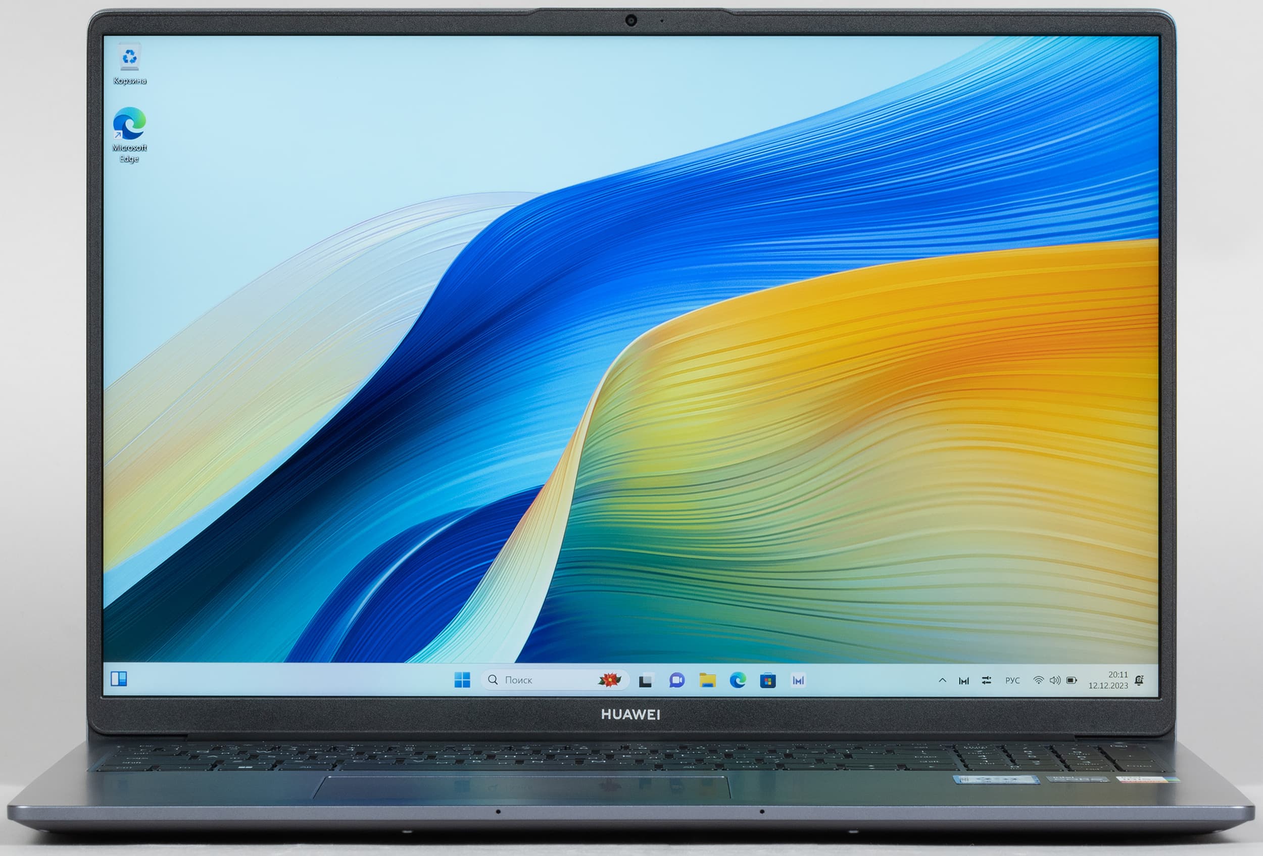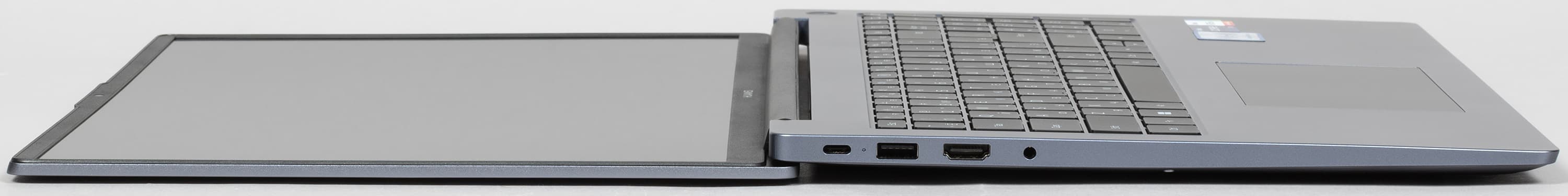 В Huawei называют экран ноутбука безрамочным, но, говоря объективно, рамка здесь есть, хотя и совсем небольшая. Ширина ее боковых сегментов составляет 5,5 мм, верхнего — 9 мм, а нижнего — 13 мм. В ноутбуке используется 16,0-дюймовая IPS-матрица с разрешением 1920×1200 пикселей (отчет edid-decode).