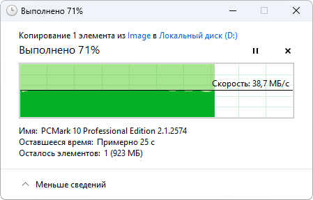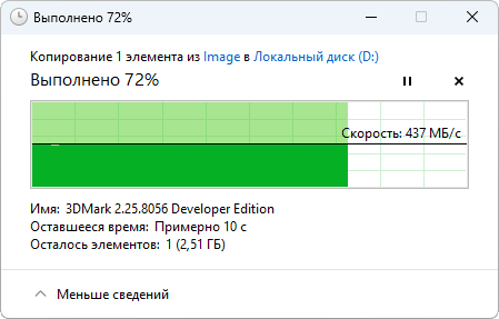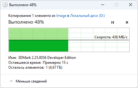 Проверим пропускную способность USB-портов внешним SSD: через оба USB 3.2 Gen1 файлы копируются со скоростью до 440 МБ/с, а через USB 2.0 — только до 40 МБ/с.
