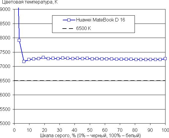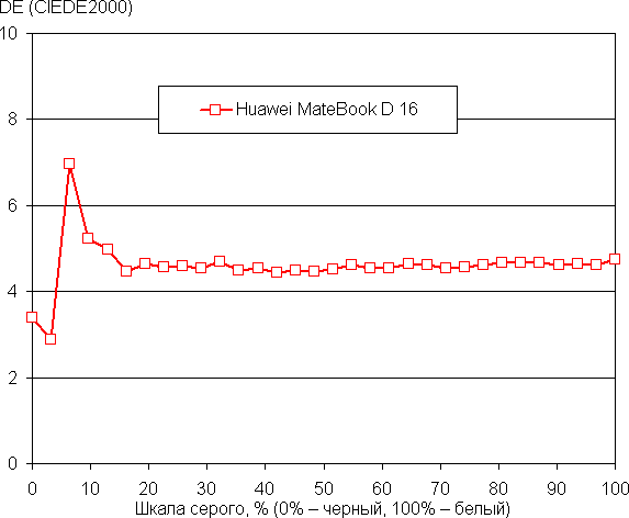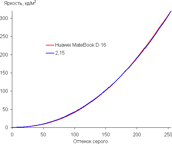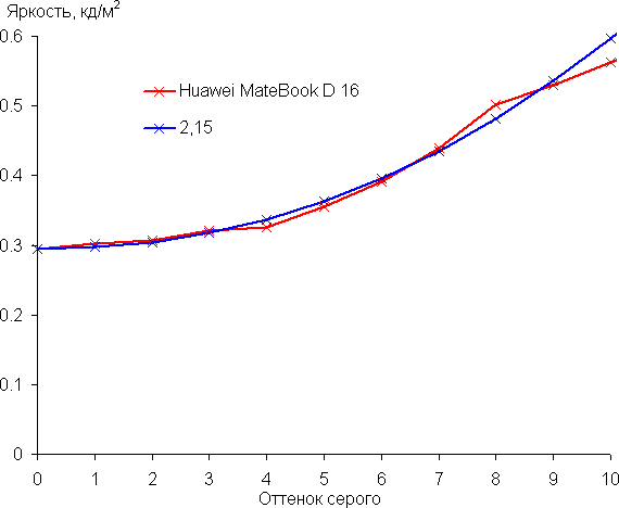 Рост прироста яркости довольно равномерный, и каждый следующий оттенок значимо ярче предыдущего. В самой темной области аппаратно и визуально различаются все оттенки:
