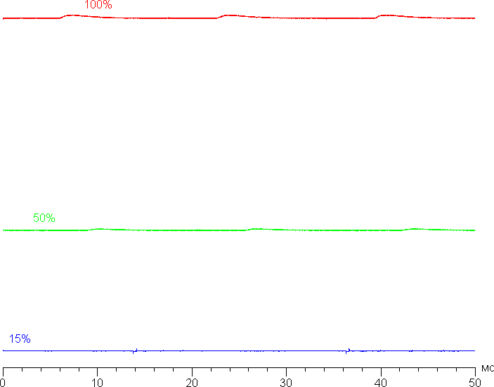 На любом уровне яркости значимая модуляция подсветки отсутствует, поэтому нет и никакого мерцания экрана. В доказательство приведем графики зависимости яркости (вертикальная ось) от времени (горизонтальная ось) при различных значениях настройки яркости: