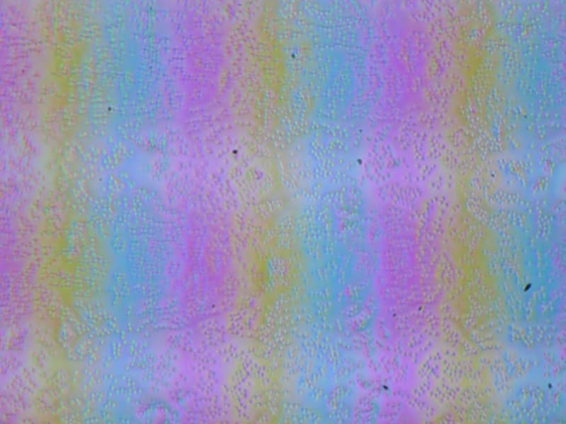 Зерно этих дефектов в несколько раз меньше размеров субпикселей (масштаб этих двух фотографий примерно одинаковый), поэтому фокусировка на микродефектах и «перескок» фокуса по субпикселям при изменении угла зрения выражены слабо, из-за этого нет и «кристаллического» эффекта.