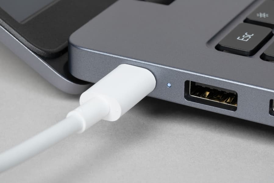 Адаптер питания соединяется с ноутбуком кабелем через единственный порт USB Type-C. Об активности заряда сигнализирует белый светодиод, расположенный рядом с разъемом.