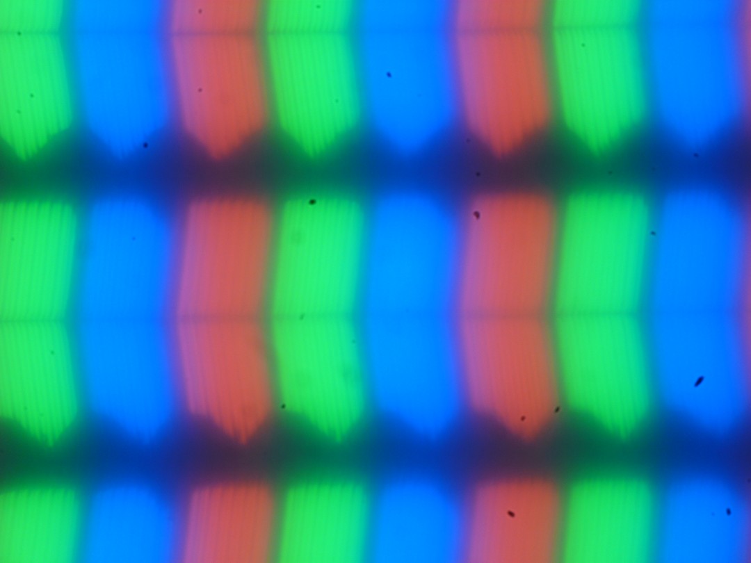 В этом ноутбуке используется матрица типа IPS. Микрофотографии демонстрируют типичную для IPS структуру субпикселей (черные точки — это пыль на матрице фотоаппарата):