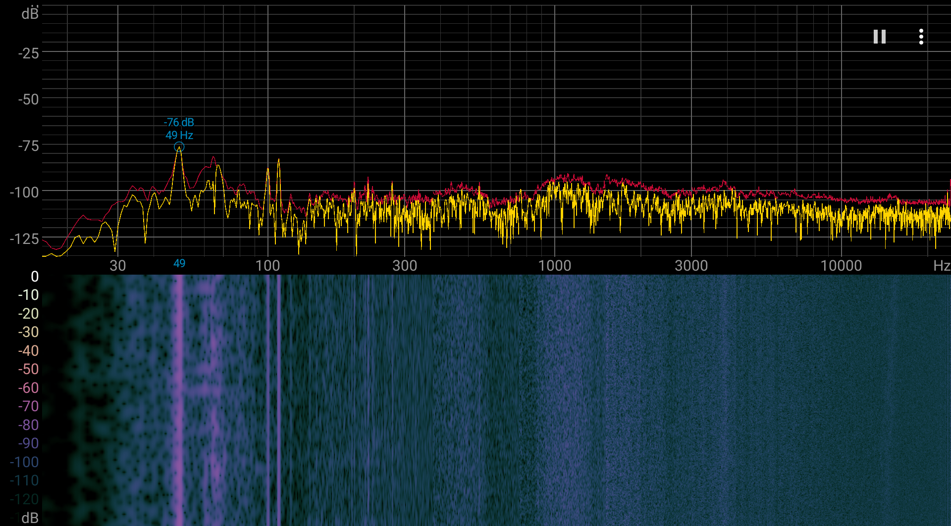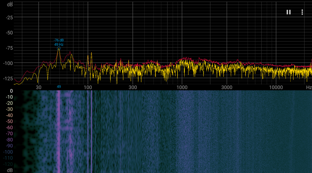 Если устройство не нагружать совсем, то его система охлаждения может работать в пассивном режиме (но прижавшись ухом к корпусу, шум от электронных компонентов расслышать можно). При большой нагрузке шум от системы охлаждения невысокий, и разницы между режимами нет (в тестах под нагрузкой мы видели, что и параметры работы в двух режимах практически идентичные). Характер шума ровный и раздражения не вызывает. Спектрограмма, полученная для максимальной скорости вентиляторов, достаточно ровная (низкочастотные пики можно не учитывать — на слух они не проявляются):