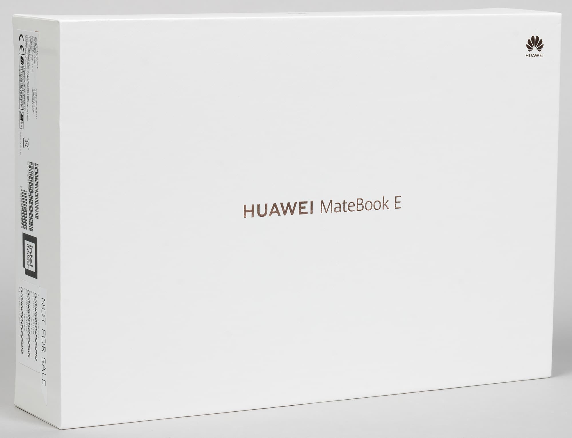 Компактная белая коробка, в которой поставляется Huawei MateBook E 2023, выполнена из плотного картона, надежно защищающего планшет от возможных повреждений. В центре лицевой стороны указано название модели, а справа сверху — логотип компании-производителя.