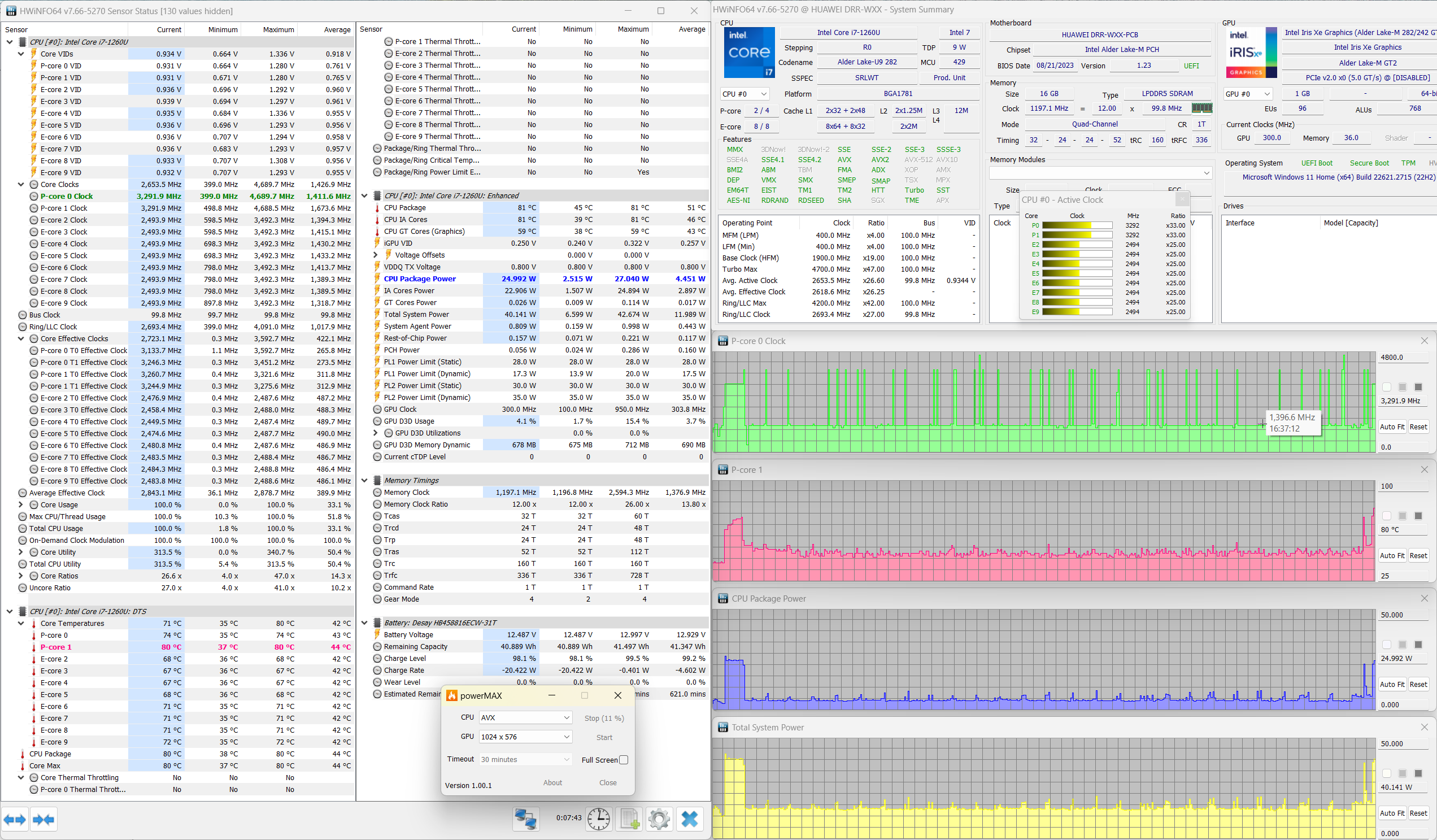 Мы протестировали оба режима MateBook E 2023 с помощью стресс-утилиты powerMax с использованием AVX-инструкций, а мониторинг осуществлялся HWinfo. Сравним работу процессора и других компонентов MateBook в двух режимах (пока при питании от электросети). Параметры в подписях указаны после стабилизации.