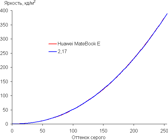 Аппроксимация полученной гамма-кривой дала показатель 2,17, что немного ниже стандартного значения 2,2, при этом реальная гамма-кривая мало отклоняется от аппроксимирующей степенной функции: