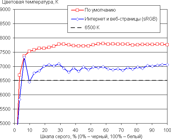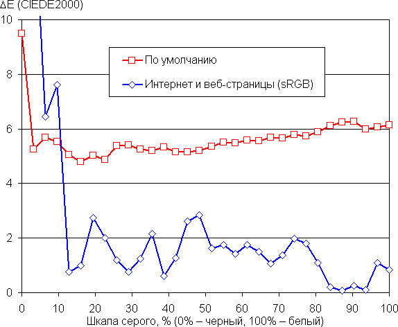 (Самые темные области шкалы серого можно не учитывать, так как там баланс цветов не имеет большого значения, да и погрешность измерений цветовых характеристик на низкой яркости большая.)