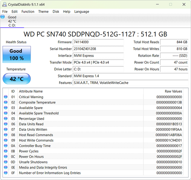 Объем SSD в планшете не изменился и равен 512 ГБ, но изменился сам накопитель: вместо Silicon Motion PCIe-8 с интерфейсом PCIe 3.0 (в модели 2022 года) теперь установлен WD PC SN740 с интерфейсом PCIe 4.0.