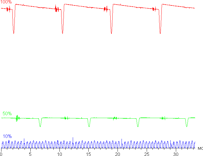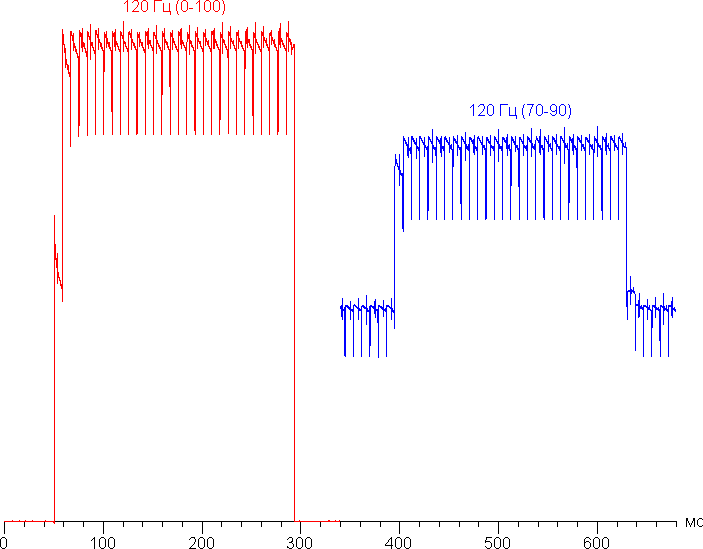 На высоком и среднем уровне яркости присутствует значимая модуляция с частотой 120 Гц. На рисунках ниже приведены зависимости яркости (вертикальная ось) от времени (горизонтальная ось) для нескольких значений настройки яркости (для режима с частотой обновления 120 Гц; зависимость реальной яркости от процентов шкалы очень нелинейная):
