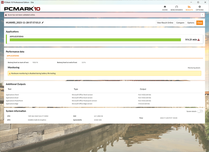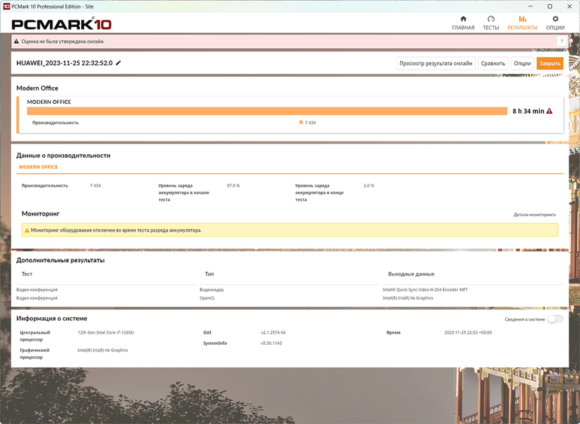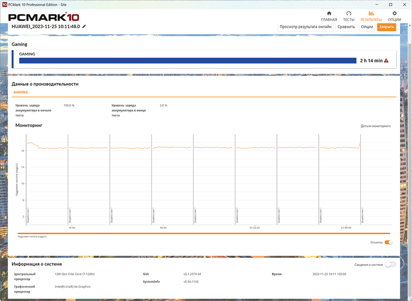 Только тест воспроизведения видео в PCMark’10 по каким-то причинам длился более одиннадцати с половиной часов. Условно-игровой тест разрядил аккумулятор за два часа с четвертью. В целом автономность Huawei MateBook E 2023 при такой скромной емкости аккумулятора весьма достойная.