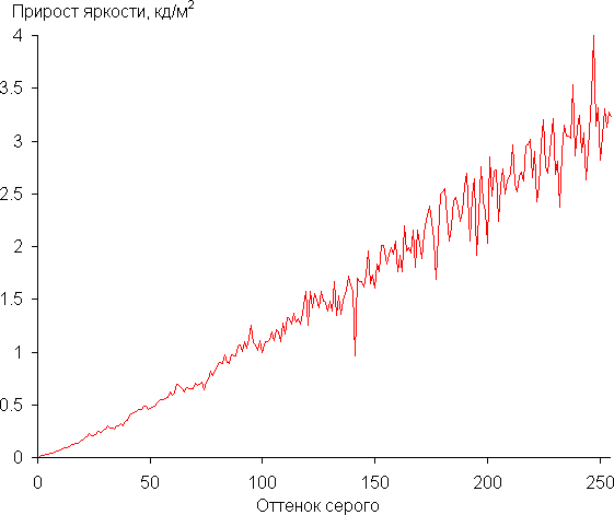Мы измерили яркость 256 оттенков серого (от 0, 0, 0 до 255, 255, 255). График ниже показывает прирост (не абсолютное значение!) яркости между соседними полутонами: