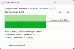 Проверка пропускной способности USB-портов внешним SSD подтвердила соответствие заявленным стандартам: оба USB 3.2 Gen2 копировали файл со скоростью до 1 ГБ/с, а USB 3.2 Gen1 — до 440 МБ/с.