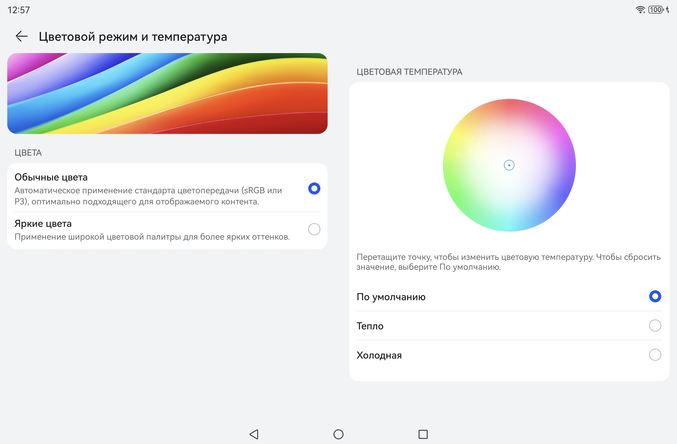 Отметим, что на экранах с уширенным цветовым охватом (без соответствующей коррекции) цвета́ обычных изображений, оптимизированных для устройств sRGB, выглядят неестественно насыщенными. Отсюда и рекомендация: в большинстве случаев смотреть кино, фотографии и все естественное лучше при выборе профиля Обычные цвета. При этом, если в изображении прописан отличный от sRGB профиль, то смотреть его лучше с использованием штатной программы Галерея.