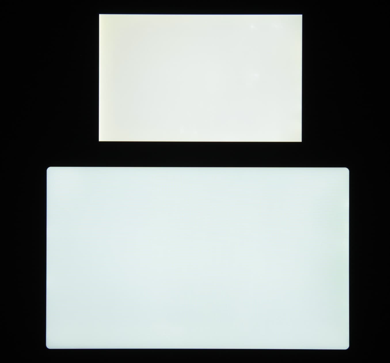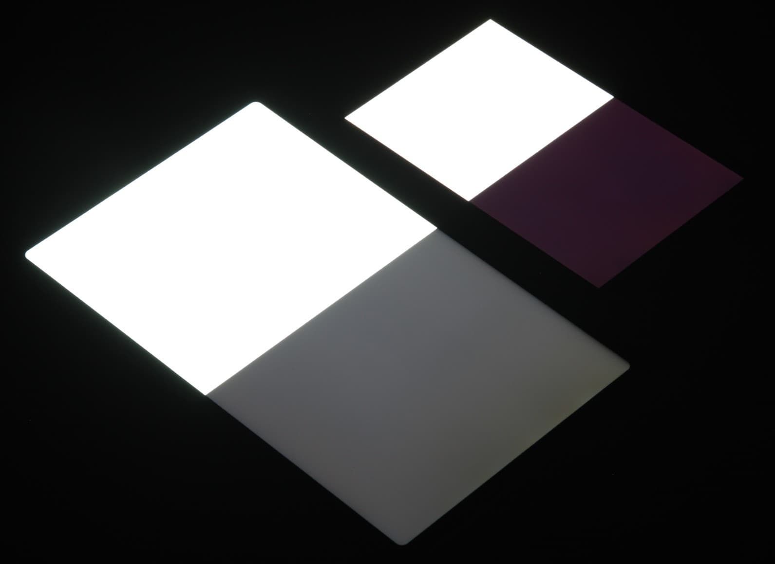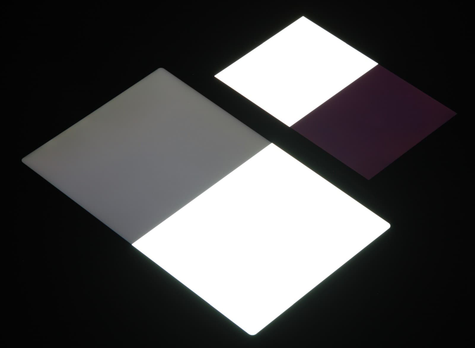 Яркость под углом у экранов уменьшилась (как минимум в 4 раза, исходя из разницы в выдержке), но в случае Huawei MatePad 10.4 яркость снизилась меньше. Черное поле при отклонении по диагонали сильно высветляется, но остается условно нейтрально-серым (так это воспринимают глаза). Фотографии ниже это демонстрируют (яркость белых участков в перпендикулярном плоскости экранов направлении одинаковая!):