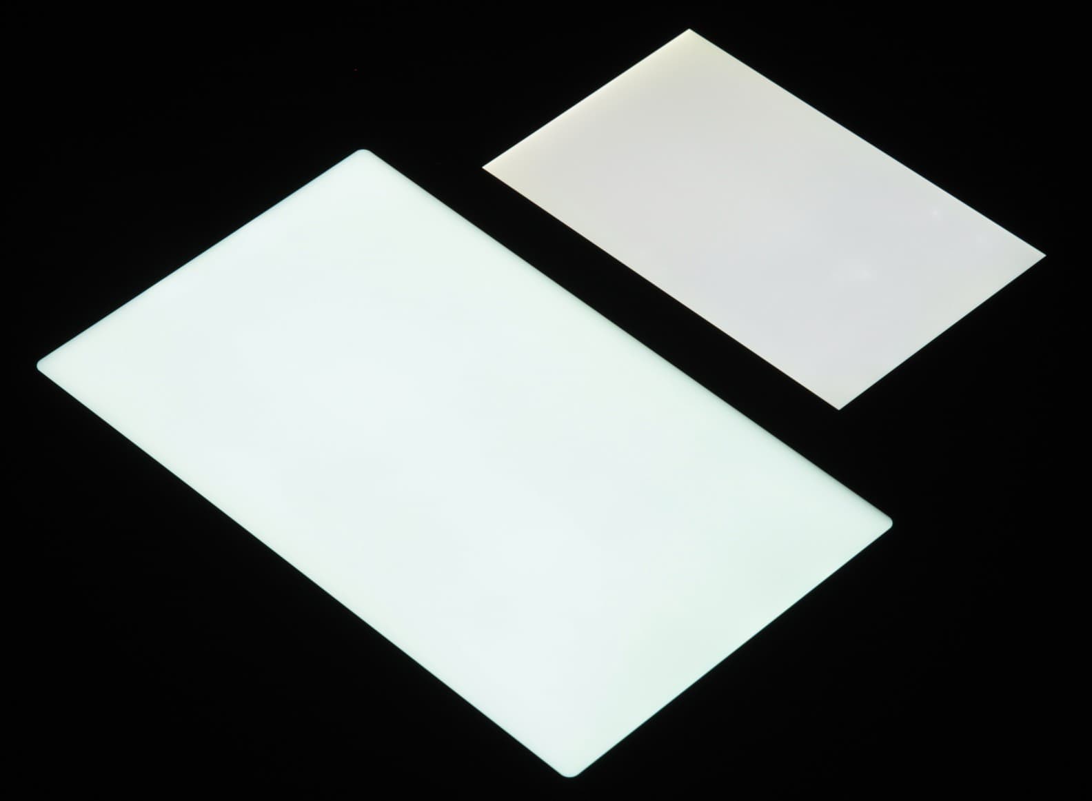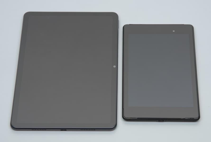 Лицевая поверхность экрана выполнена в виде стеклянной пластины с зеркально-гладкой поверхностью, устойчивой к появлению царапин. Судя по отражению объектов, антибликовые свойства экрана чуть лучше, чем у экрана Google Nexus 7 (2013) (далее просто Nexus 7). Для наглядности приведем фотографию, на которой в выключенных экранах отражается белая поверхность (слева — Huawei MatePad 10.4, справа — Nexus 7, далее их можно различать по размеру):