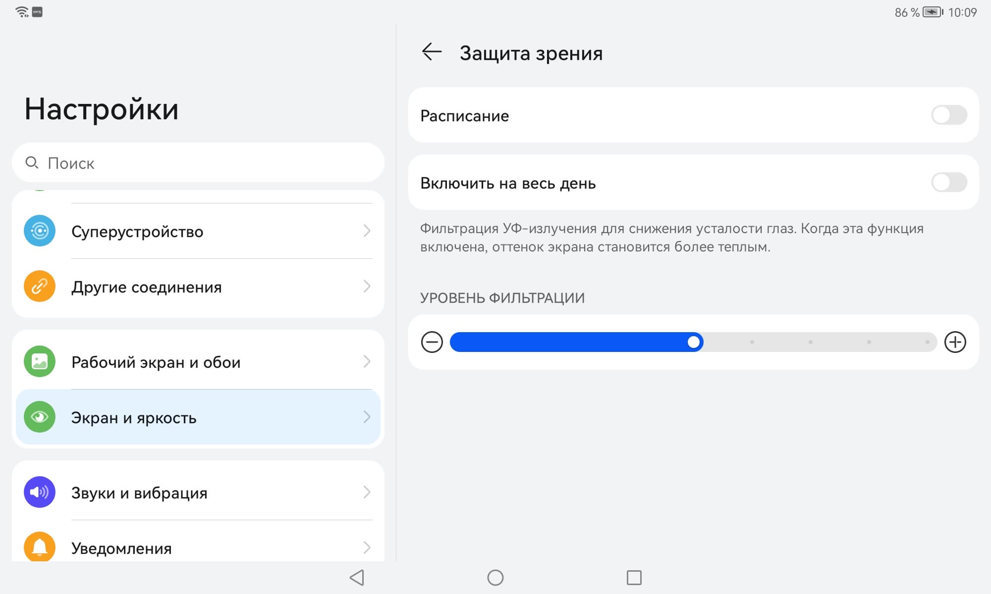 Присутствует модная настройка, позволяющая снизить интенсивность синей компоненты.