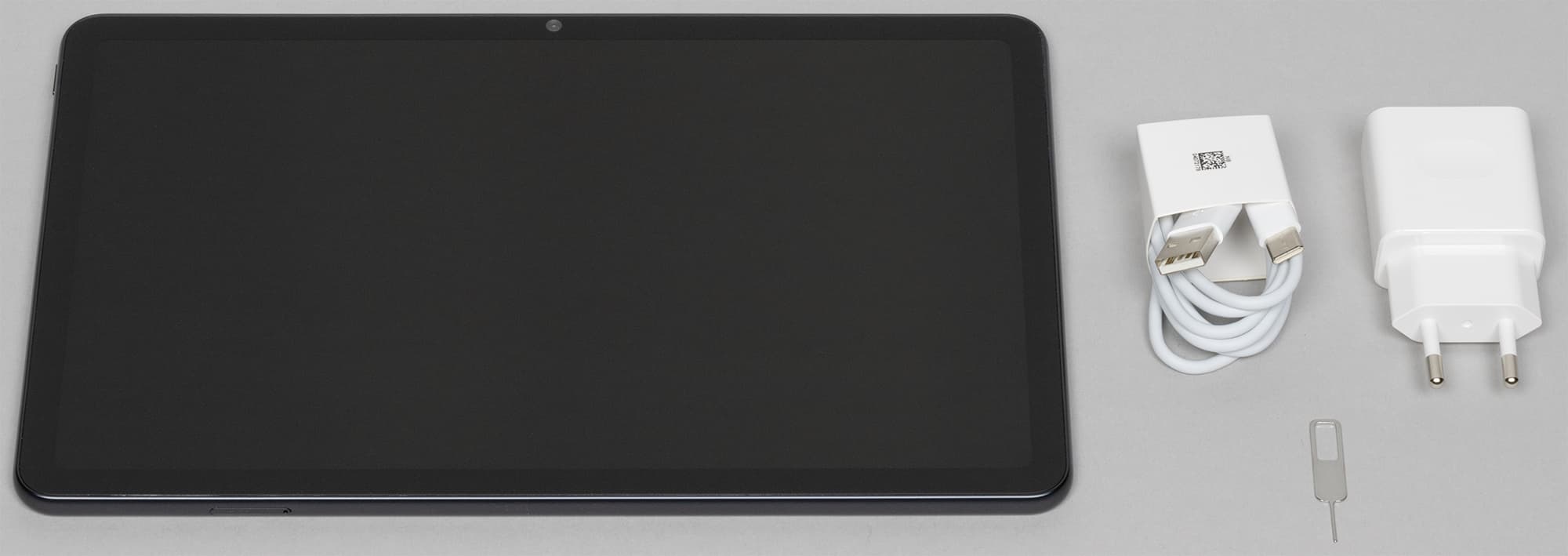 Комплектация — стандартная: зарядный блок 5 В 2 А, с поддержкой быстрой зарядки (9 В 2 А или 10 В 2,25 А), кабель USB-A — USB-C, ключик для извлечения лотка для карты памяти и SIM-карты.