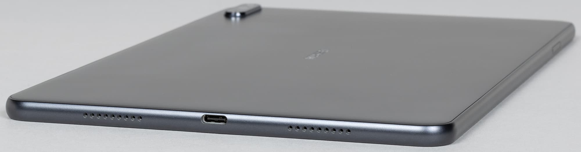 На скругленных боковых гранях расположены стереодинамики (для бюджетного планшета это плюс). Кроме того, на правой грани по центру есть разъем USB-C, а на левой — небольшая продолговатая кнопка питания.