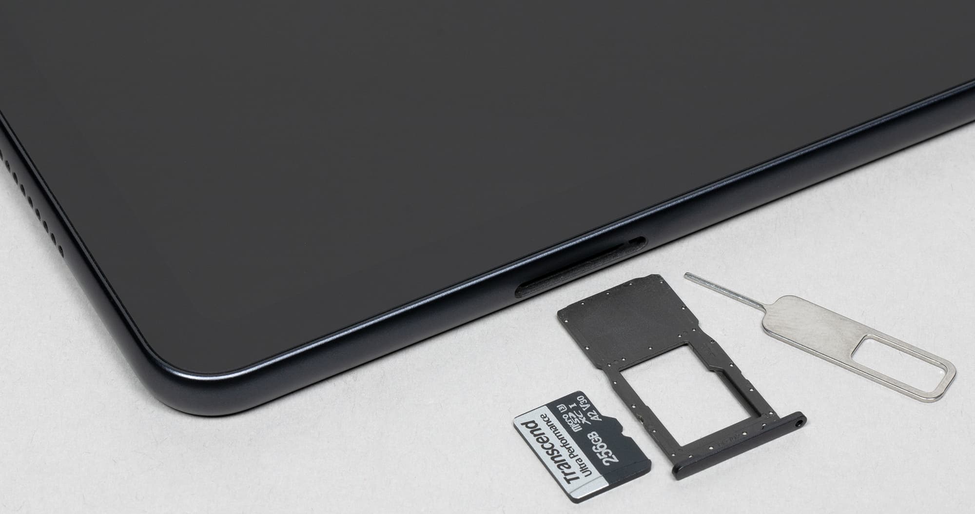Сверху прямо над блоком с камерами — узкая вытянутая качелька регулировки громкости, а далее по всей длине грани — четыре микрофона. Ну а на нижней грани — только слот для карты памяти (а в версии с LTE-модулем — еще и для симки).