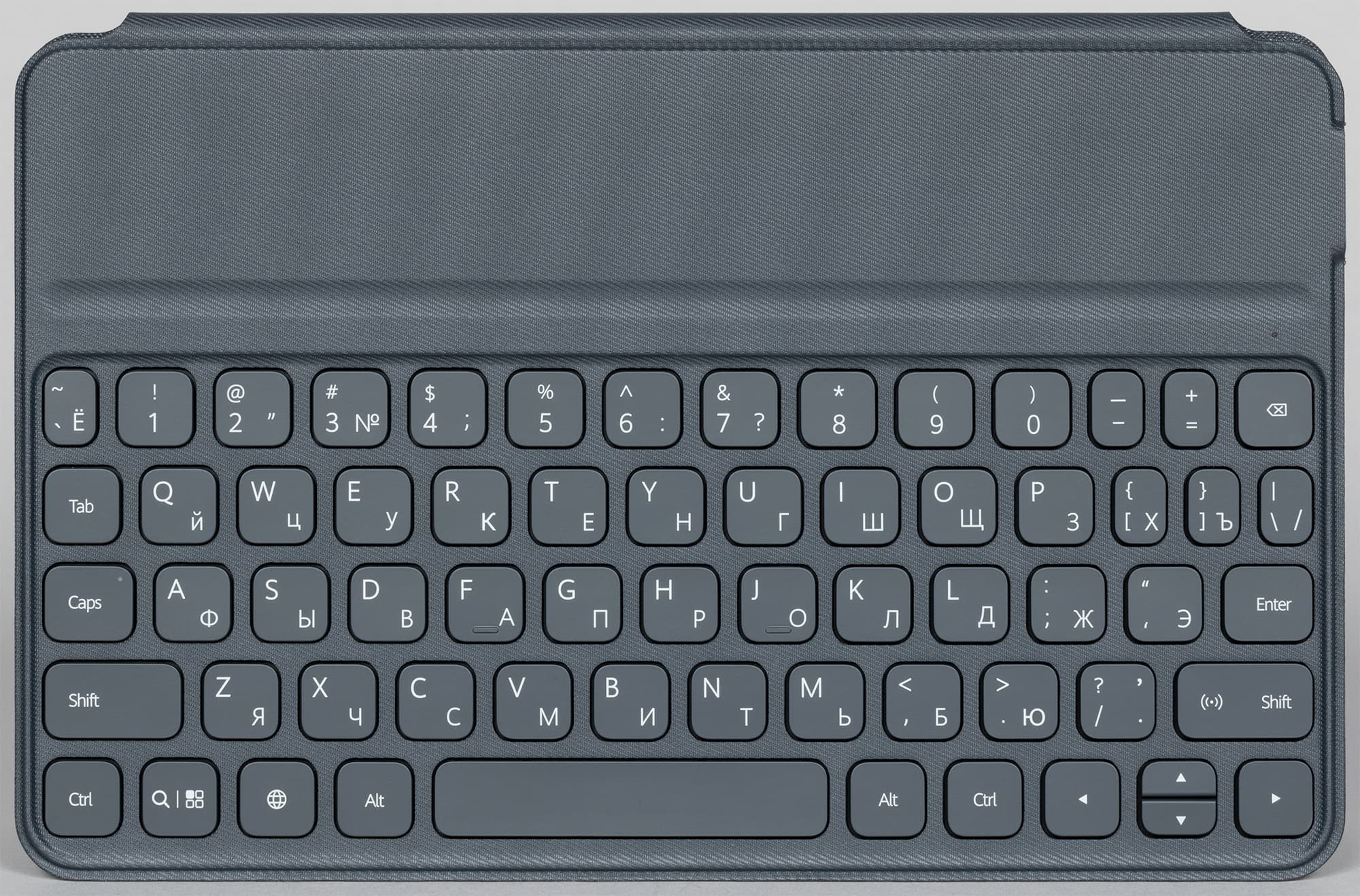 Клавиатура в целом похожа на ту, что мы тестировали с MatePad 11. По крайней мере, материалы те же, да и раскладка похожа. Однако, здесь изменилось назначение двух кнопок слева от пробела. Судя по значкам на них, одна должна переключать раскладку, другая же — вызывать поиск или миниатюры окон. Но нам так и не удалось заставить их работать (в частности, раскладка здесь меняется сочетанием Ctrl+Пробел).