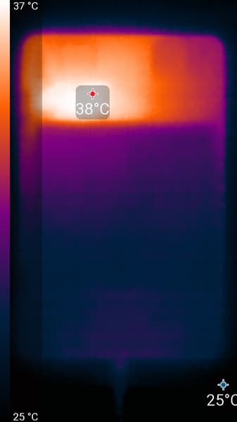 Область высокого нагрева, видимо, соответствует расположению микросхемы SoC. По данным теплокамеры, максимальный нагрев в этой области составил 38 градусов (при температуре окружающего воздуха в 24 градуса), это не очень много.
