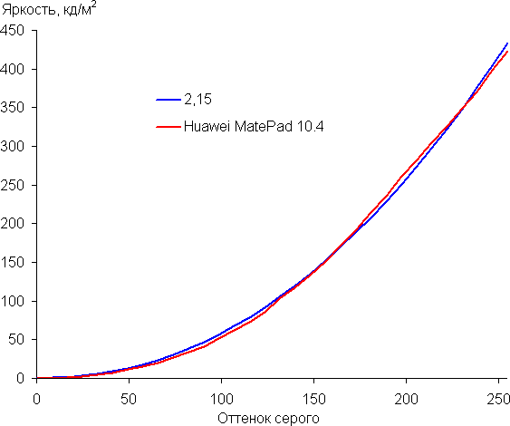 Экран имеет хорошие углы обзора без значительного сдвига цветов даже при больших отклонениях взгляда от перпендикуляра к экрану и без инвертирования оттенков. Для сравнения приведем фотографии, на которых на экраны Huawei MatePad 10.4 и Nexus 7 выведены одинаковые изображения, при этом яркость экранов изначально установлена примерно на 200 кд/м², а цветовой баланс на фотоаппарате принудительно переключен на 6500 К.
