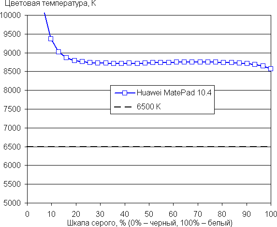 По умолчанию баланс оттенков на шкале серого средний, так как цветовая температура существенно выше стандартных 6500 К, и отклонение от спектра абсолютно черного тела (ΔE) больше 10, что даже для потребительского устройства считается плохим показателем. (Самые темные области шкалы серого можно не учитывать, так как там баланс цветов не имеет большого значения, да и погрешность измерений цветовых характеристик на низкой яркости большая.)