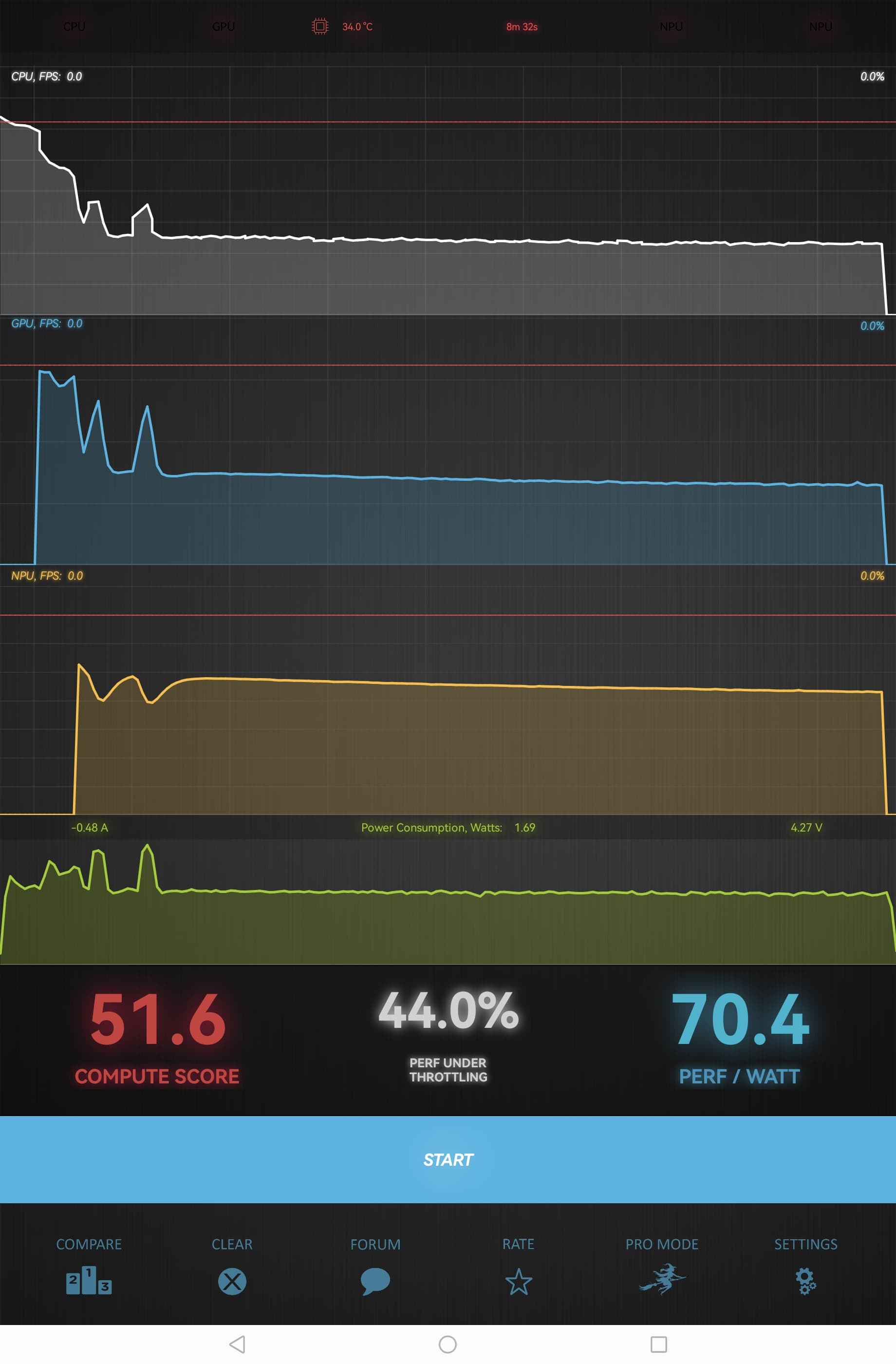 Тест на снижение производительности при нагреве мы проводим с помощью программы Burnout Benchmark, которая позволяет нагружать CPU, GPU и NPU: