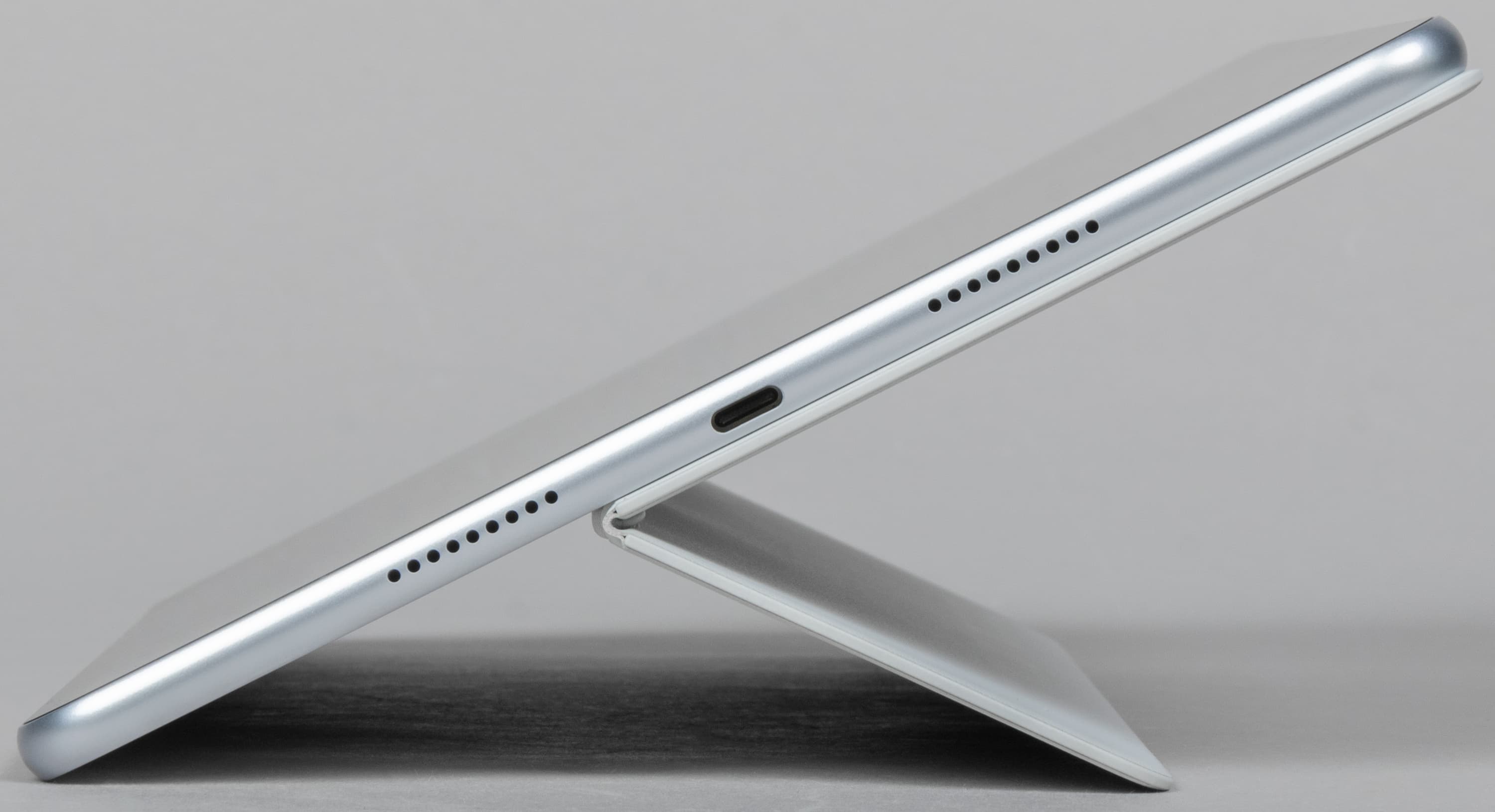Когда на планшет надеты обе части чехла-клавиатуры, они защищают устройство с обеих сторон. При этом во время работы доступен только один угол наклона экрана — как на фото ниже.