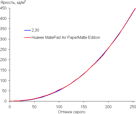 Построенная по 32 точкам с равным интервалом по численному значению оттенка серого гамма-кривая не выявила завала ни в светах, ни в тенях. Показатель аппроксимирующей степенной функции равен 2,30, что немного выше стандартного значения 2,2, поэтому картинка чуть затемнена. При этом реальная гамма-кривая мало отклоняется от степенной зависимости: