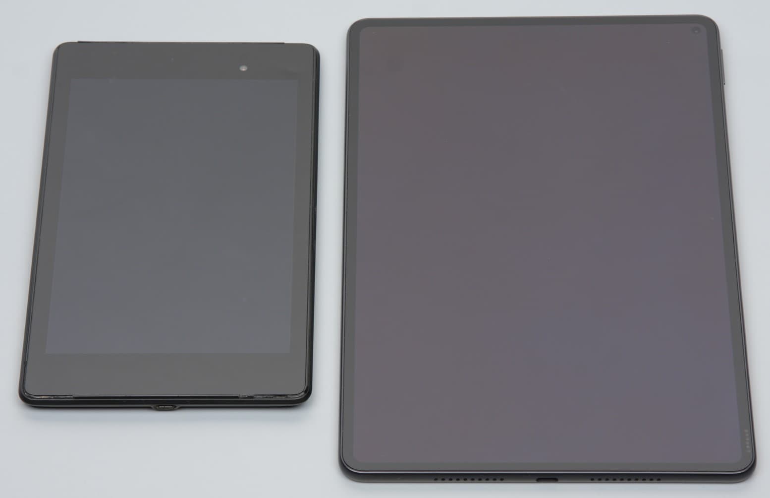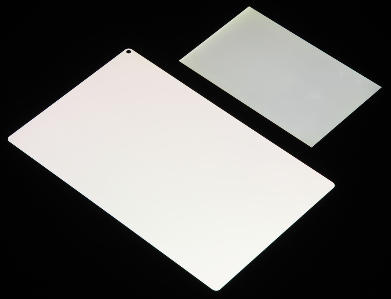 Лицевая поверхность экрана выполнена в виде стеклянной пластины с зеркально-гладкой поверхностью, устойчивой к появлению царапин. Судя по отражению объектов, антибликовые свойства экрана не хуже, чем у экрана Google Nexus 7 (2013) (далее просто Nexus 7). Для наглядности приведем фотографию, на которой в выключенных экранах отражается белая поверхность (слева — Nexus 7, справа — Huawei MatePad Pro 11, далее их можно различать по размеру):