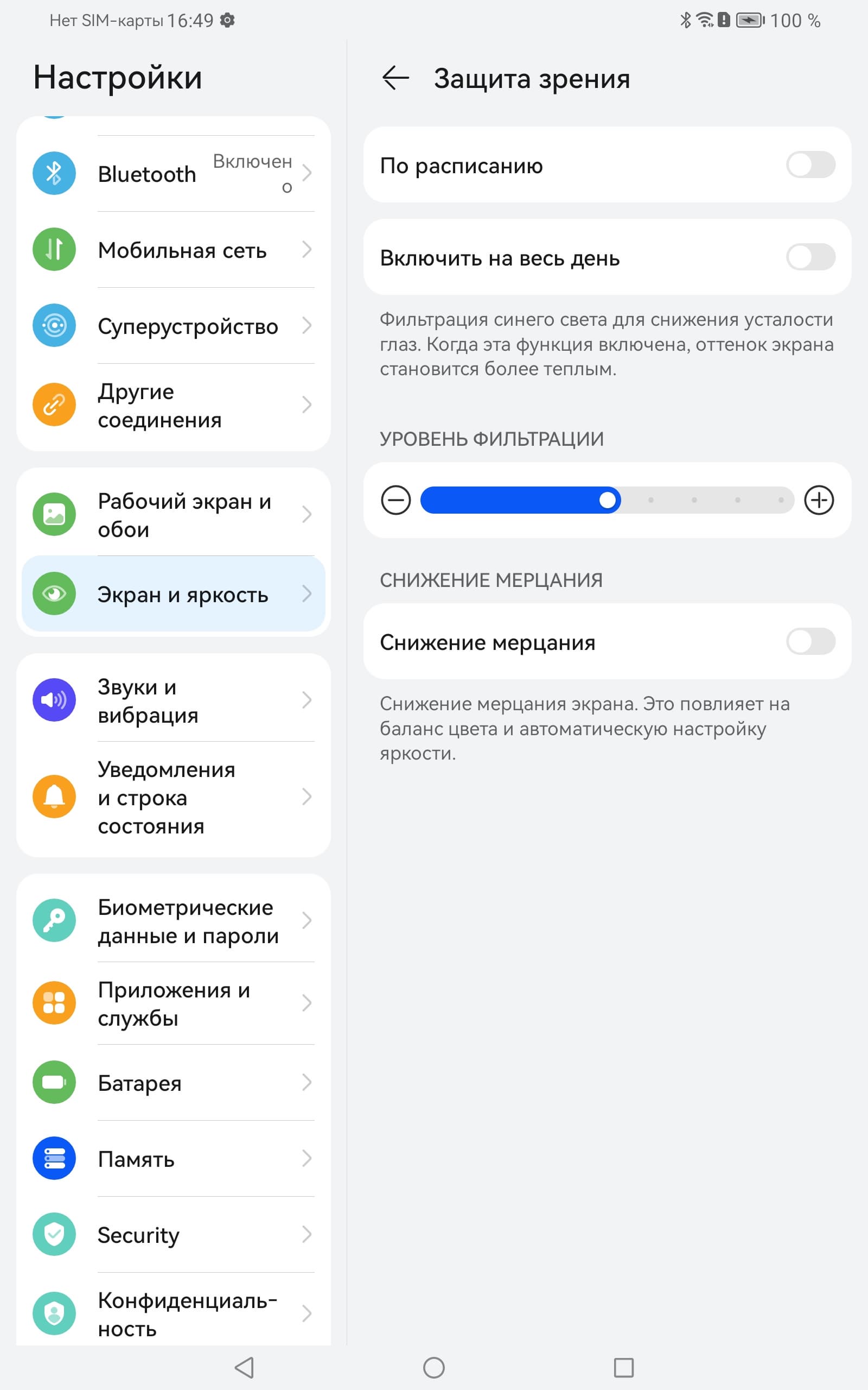 Разумеется есть функция снижения интенсивности синей компоненты (снимок экрана с настройкой был выше). В ее описании, конечно, приведена дезинформация про усталость глаз (но хоть УФ-излучение наконец-то заменили на синий свет). В принципе, яркий свет может приводить к нарушению суточного (циркадного) ритма, но все решается снижением яркости до низкого, но еще комфортного уровня, а искажать цветовой баланс, уменьшая вклад синего, нет абсолютно никакого смысла.