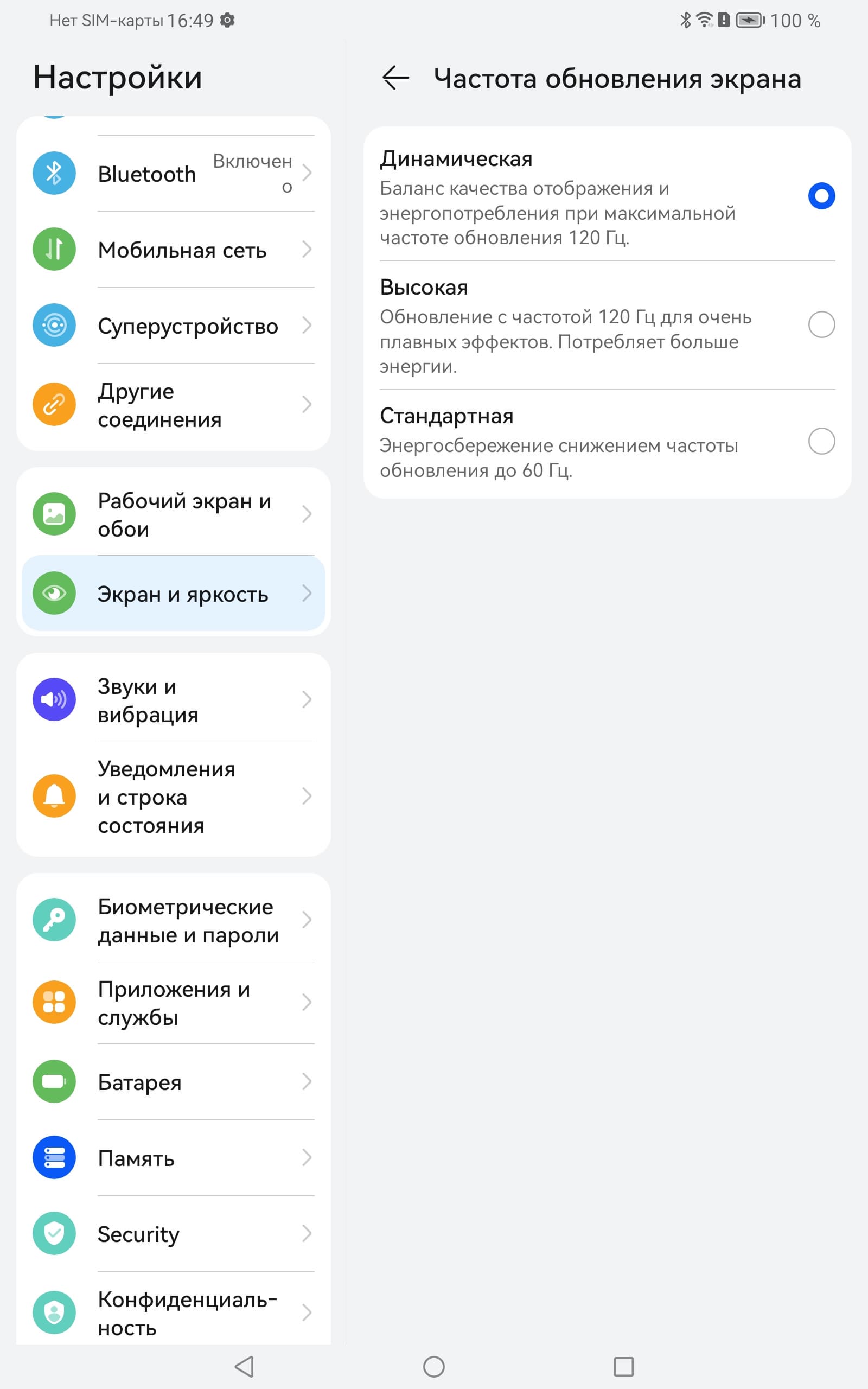 В настройках экрана можно включить режим с повышенной до 120 Гц частотой обновления: