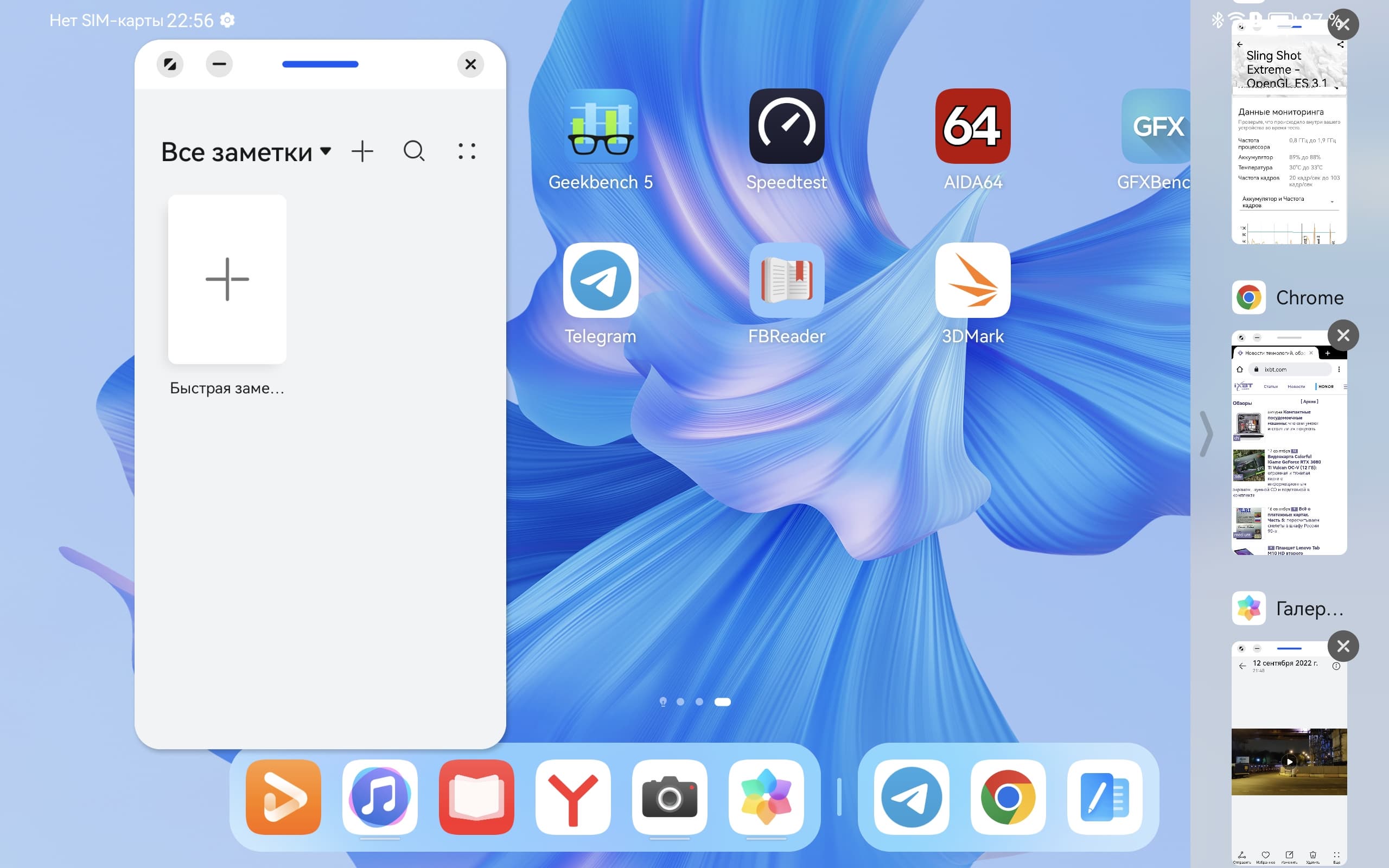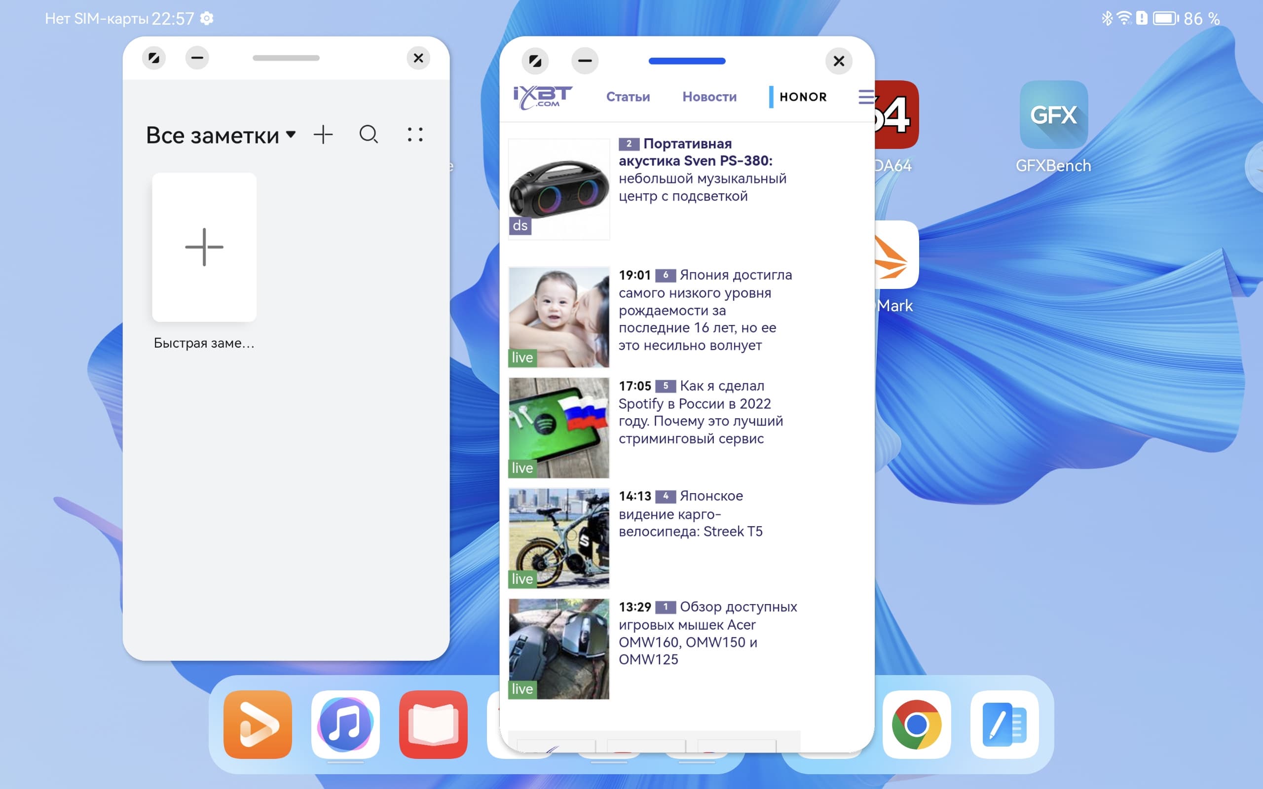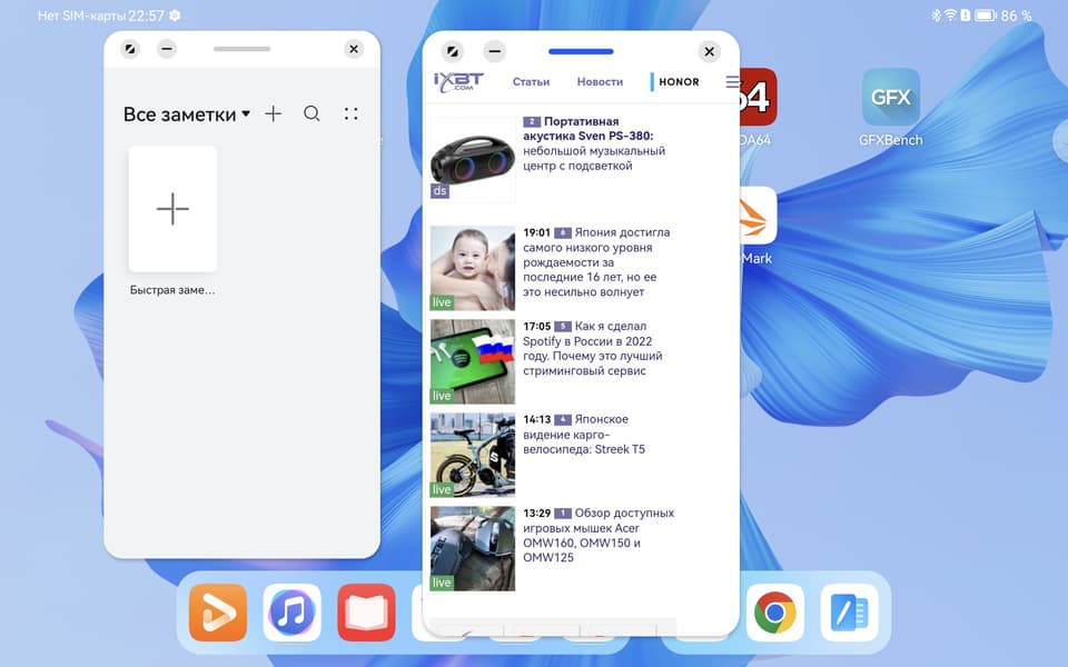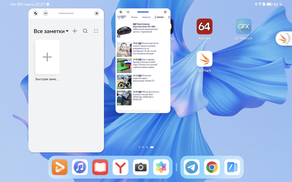 На MatePad Pro установлена новейшая версия операционной системы Huawei — Harmony OS 3.0. Ранее мы рассказывали о Harmony OS 2.0, так что не будем повторять сказанное там. В данном же случае нам интересны новшества. Они касаются, прежде всего, возможностей разделения экрана под окна нескольких приложений и тонкой настройки рабочего пространства под свои нужды.