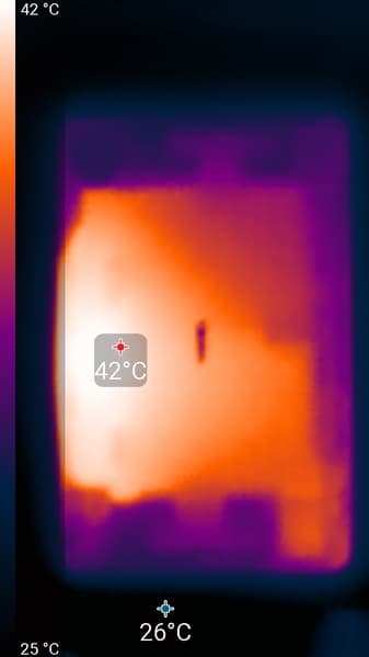 Нагрев больше в правой части аппарата, что, видимо, соответствует расположению микросхемы SoC. По данным теплокамеры, максимальный нагрев составил 42 градуса (при температуре окружающего воздуха в 24 градуса). Такой нагрев нельзя назвать незначительным.