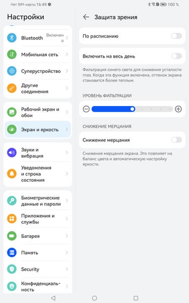 Экран у Huawei MatePad Pro 11 немного темнее (яркость по фотографиям 100 против 103 у Nexus 7). Двоение отраженных объектов в экране Huawei MatePad Pro 11 очень слабое, это свидетельствует о том, что между слоями экрана нет воздушного промежутка (экран типа OGS — One Glass Solution). За счет меньшего числа границ (типа стекло/воздух) с сильно различающимися коэффициентами преломления такие экраны лучше смотрятся в условиях интенсивной внешней засветки, но вот их ремонт в случае потрескавшегося внешнего стекла обходится гораздо дороже, так как менять приходится экран целиком. На внешней поверхности экрана есть специальное олеофобное (жироотталкивающее) покрытие, которое по эффективности лучше, чем у Nexus 7, поэтому следы от пальцев удаляются существенно легче, а появляются с меньшей скоростью, чем в случае обычного стекла.