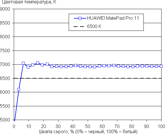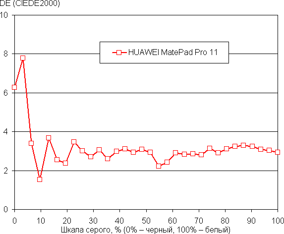 Напомним, что в случае OLED-экранов яркость фрагментов изображения динамично меняется в соответствии с характером выводимого изображения — чуть уменьшается для светлых в целом изображений. В итоге полученная зависимость яркости от оттенка (гамма-кривая), скорее всего, не соответствует гамма-кривой статичного изображения, так как измерения проводились при последовательном выводе оттенков серого почти на весь экран.