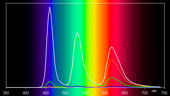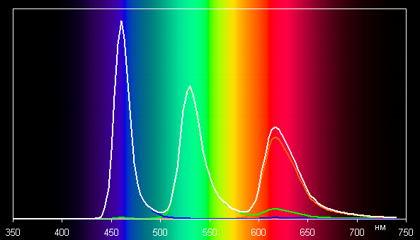 В этом устройстве есть возможность скорректировать цветовой баланс с помощью выбора профиля цветовой температуры или регулировки оттенка на цветовом круге (см. снимки выше). Впрочем, в случае профиля Обычные цвета даже без коррекции баланс оттенков на шкале серого хороший, так как цветовая температура достаточно близка к стандартным 6500 К, и отклонение от спектра абсолютно черного тела (ΔE) ниже 10 единиц, что для потребительского устройства считается хорошим показателем. При этом цветовая температура и ΔE мало изменяются от оттенка к оттенку — это положительно сказывается на визуальной оценке цветового баланса. (Самые темные области шкалы серого можно не учитывать, так как там баланс цветов не имеет большого значения, да и погрешность измерений цветовых характеристик на низкой яркости большая.)