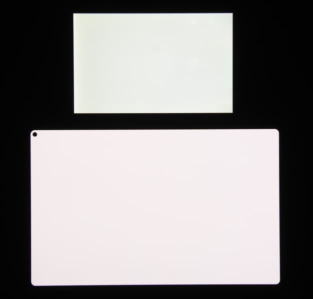 Экран характеризуется великолепными углами обзора. Правда, белый цвет при отклонении на относительно большие углы поочередно приобретает легкий розоватый и сине-зеленый оттенок, но черный цвет остается просто черным под любыми углами. Он настолько черный, что параметр контрастности в данном случае неприменим. Для сравнения приведем фотографии, на которых на экран Huawei MatePad Pro 11 и на экран второго участника сравнения выведены одинаковые изображения, при этом яркость экранов изначально установлена примерно на 200 кд/м², а цветовой баланс на фотоаппарате принудительно переключен на 6500 К.