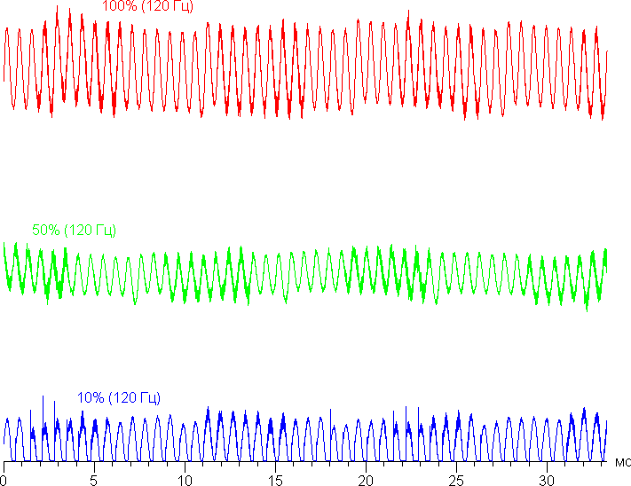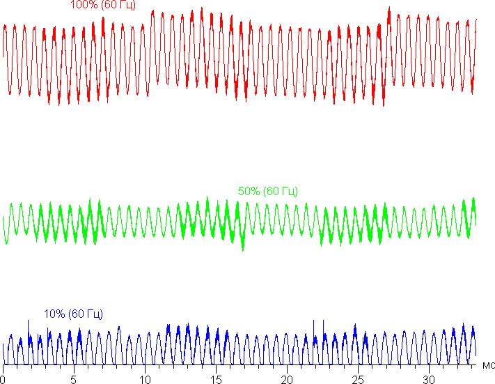 На любом уровне яркости присутствует значимая модуляция с частотой примерно 1440 Гц. На рисунке ниже приведены зависимости яркости (вертикальная ось) от времени (горизонтальная ось) для нескольких значений настройки яркости. Сначала для режима с частотой обновления 60 Гц: