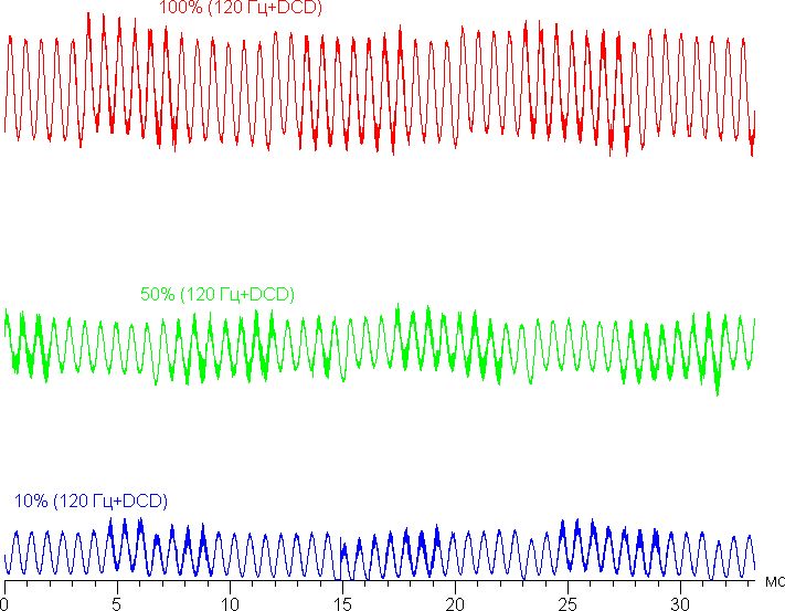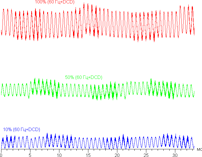 В англоязычной литературе и в новостях обычно используют название DC Dimming (на графиках сократим до DCD). При включении этой функции принципиальных изменений нет, только на очень низкой яркости немного уменьшилась амплитуда. Режим с частотой обновления 60 Гц: