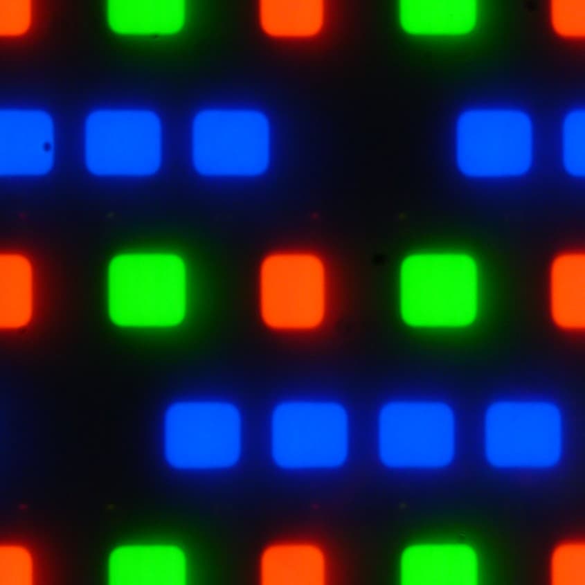 В этом экране используется матрица AMOLED — активная матрица на органических светодиодах. Полноцветное изображение создается с помощью субпикселей трех цветов — красного (R), зеленого (G) и синего (B) в равном количестве. Это подтверждается фрагментом микрофотографии: