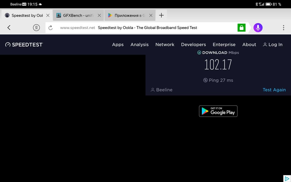 Устройство поддерживает Wi-Fi 6 и LTE (в той версии, которая была у нас на тестировании). Поддержки 5G нет, но для России это не особо актуально. Ниже — тест скорости в LTE, проведенный с помощью браузерной версии Speedtest.net.