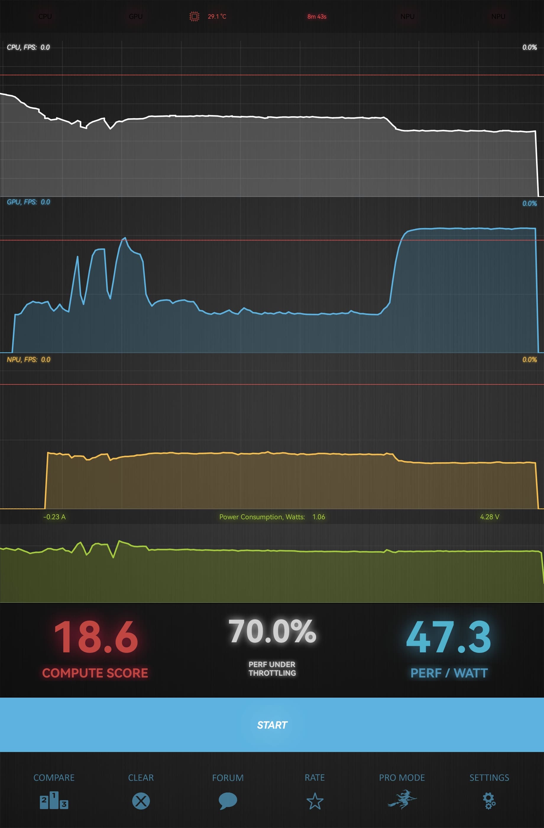 При длительном интенсивном использовании падение производительности может быть заметным, но всё же не чрезмерным и поменьше, чем у предшественника: в среднем до 70%, о чем свидетельствует Burnout Benchmark, нагружающий SoC в течение десяти минут и замеряющий уровень тротлинга.