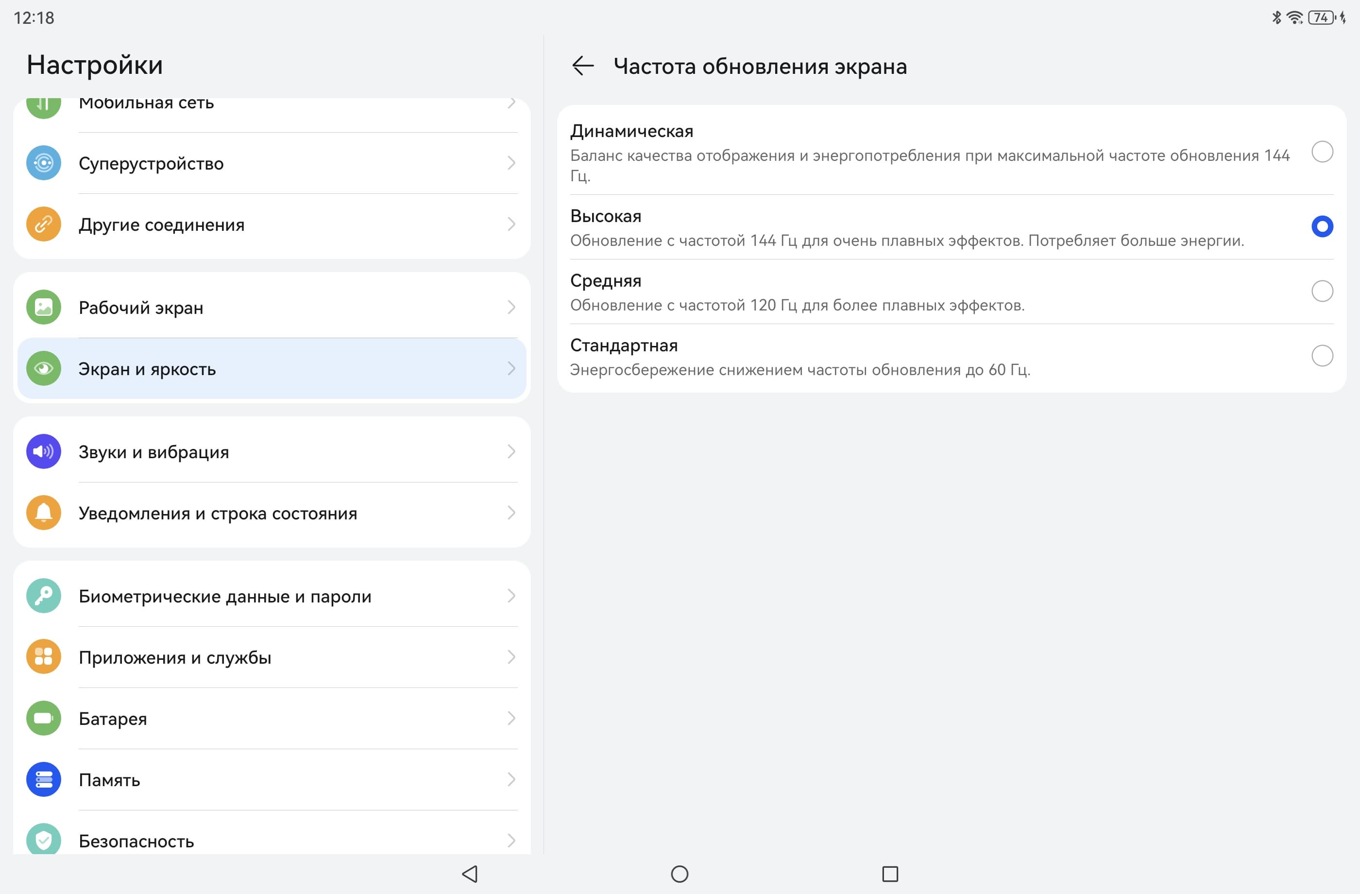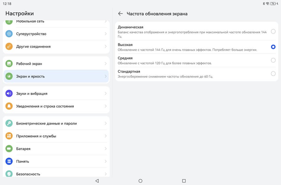 В настройках экрана можно включить режим с повышенной до 144 Гц частотой обновления: