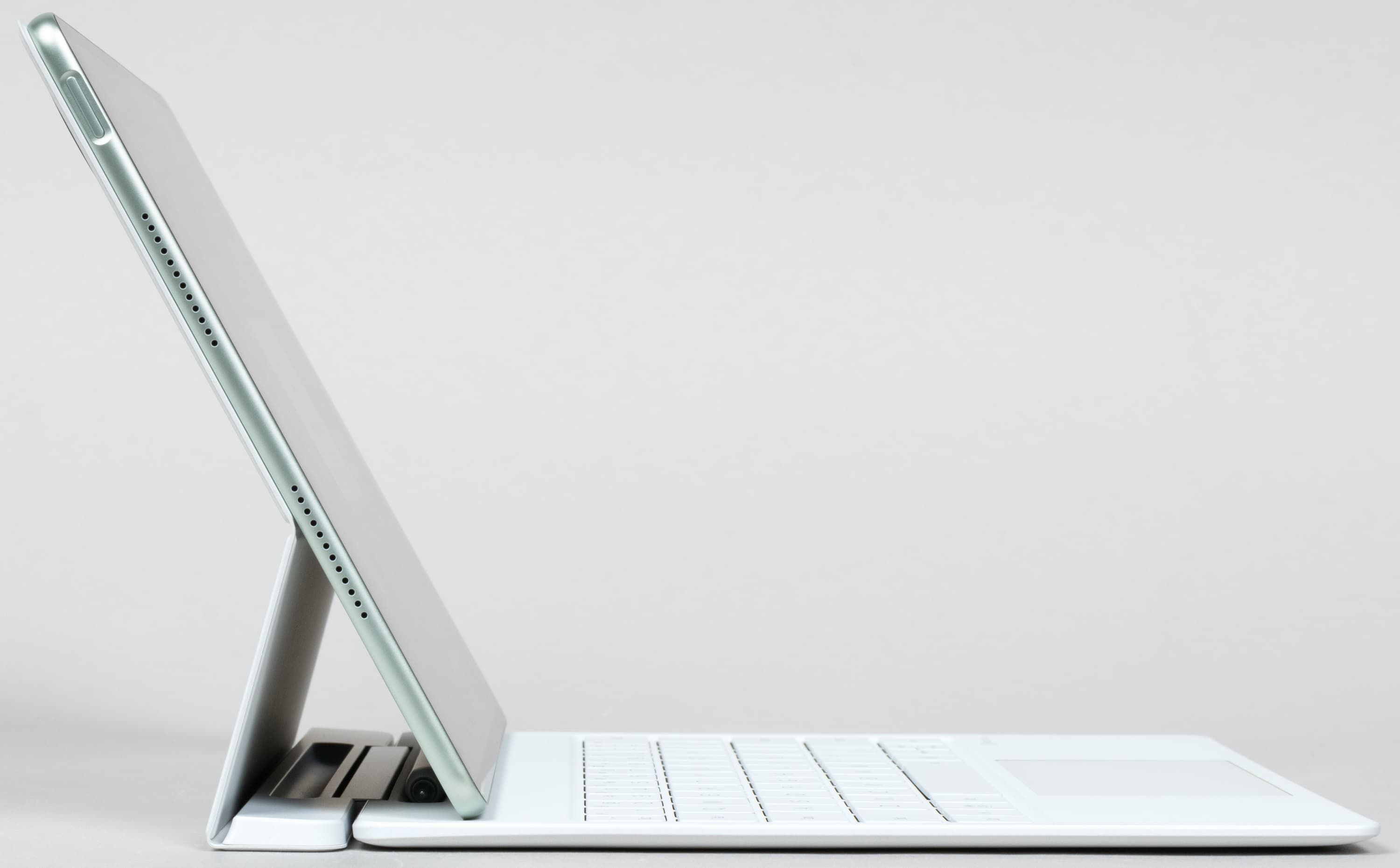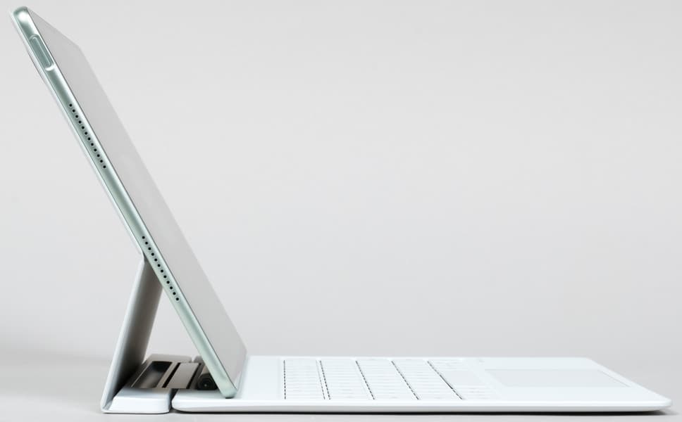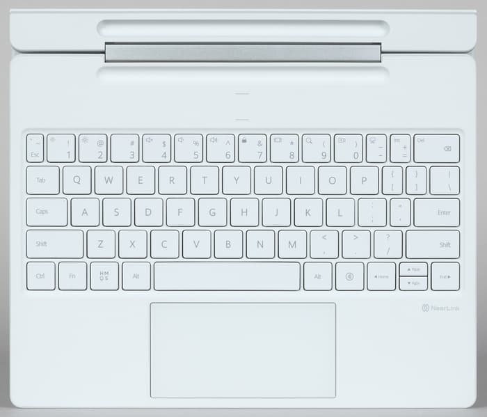 Судя по всему, по сравнению с прошлогодним вариантом обложка-клавиатура не претерпела изменений. Аксессуар представляет собой единую конструкцию, в основании которой блок из металла и твердой пластмассы, благодаря чему у планшета можно гибко варьировать угол наклона при использовании его в режиме ноутбука.