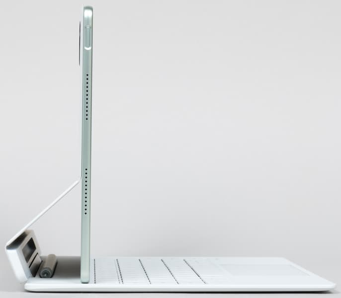 Итак, ничего нового мы про дизайн планшета не скажем, отметим только новый цвет — пожалуй, еще более интересный, чем прошлогодний золотистый. Но главные качества остались неизменными: минимальная толщина, рекордно узкая рамка вокруг экрана (особенно вдоль длинных сторон), быстрый порт USB, удобная кнопка питания, стереодинамики.